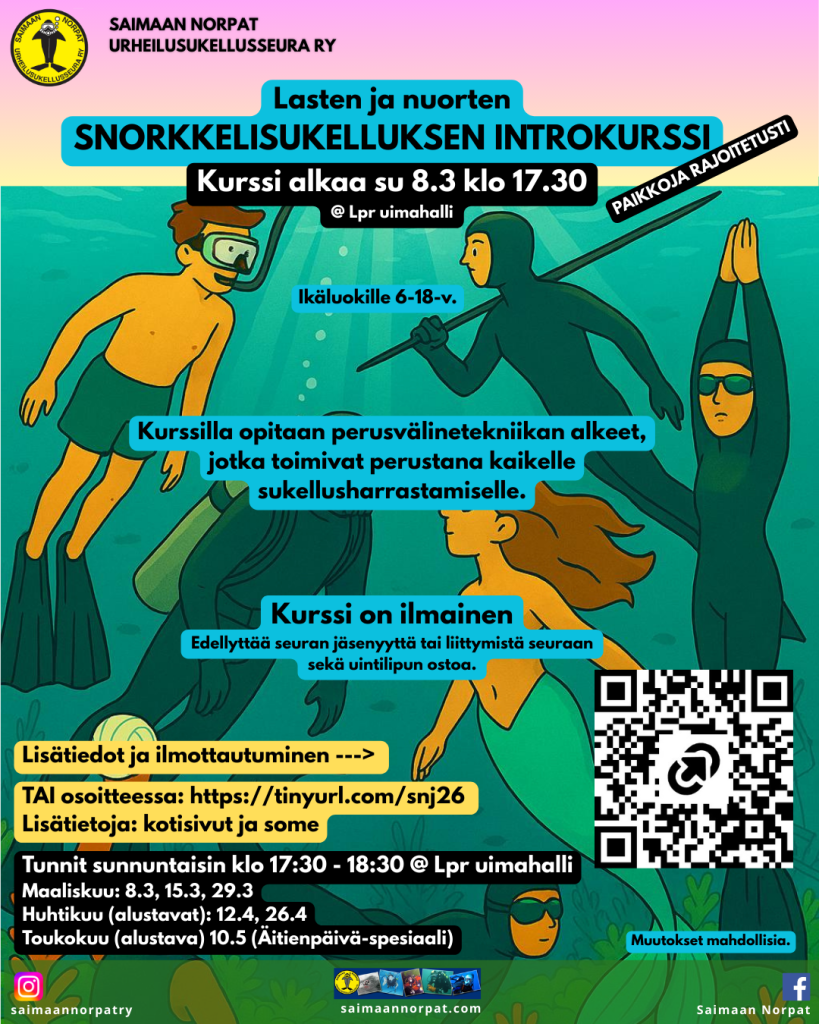 Keväällä 2026 pidetään ILMAINEN snorkkelisukelluksen ”introkurssi”. Ilman huoltajaa/vanhempaa osallistuvan junnun pitää olla 10v+ ja hänen tulisi pystyä uimaan yhtäjaksoisesti noin 50m. Vanhemman kanssa osallistuvan 6+ -vuotiaan tulee osata uida riittävästi siten, että pystyy toimimaan vanhempansa/huoltajansa kanssa sekä pitkässä, että hyppyaltaassa.